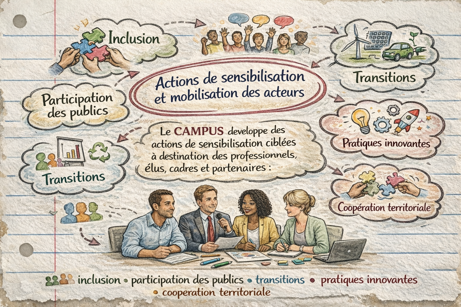 Le CAMPUS développe des actions de sensibilisation ciblées à destination des professionnels, élus, cadres et partenaires : inclusion, participation des publics, transitions, pratiques innovantes, coopération territoriale.