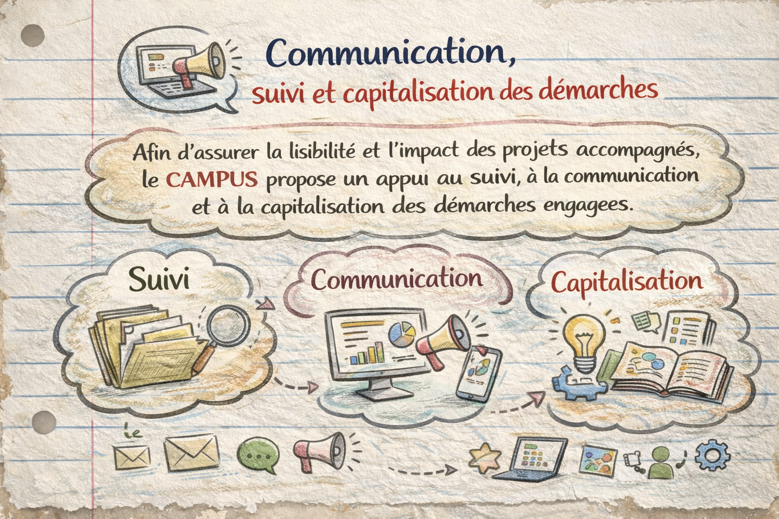 Afin d’assurer la lisibilité et l’impact des projets accompagnés, le CAMPUS propose un appui au suivi, à la communication et à la capitalisation des démarches engagées.