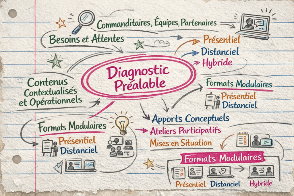Chaque intervention repose sur un diagnostic préalable des attentes, associant commanditaires, équipes et partenaires, afin de garantir des contenus utiles, contextualisés et opérationnels.